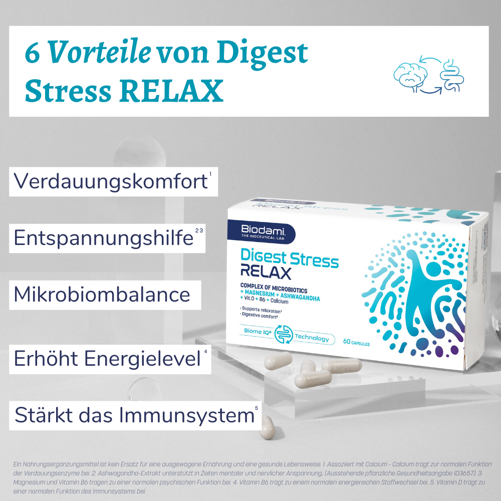 Dieses lebenswichtige Kommunikationsnetz zwischen Ihrem Darm und Ihrem Gehirn beeinflusst Ihr gesamtes Wohlbefinden. Unsere innovative Formel zielt auf die Ursache von Stress und Verdauungsbeschwerden ab, indem sie auf die Darm-Hirn-Achse wirkt.
