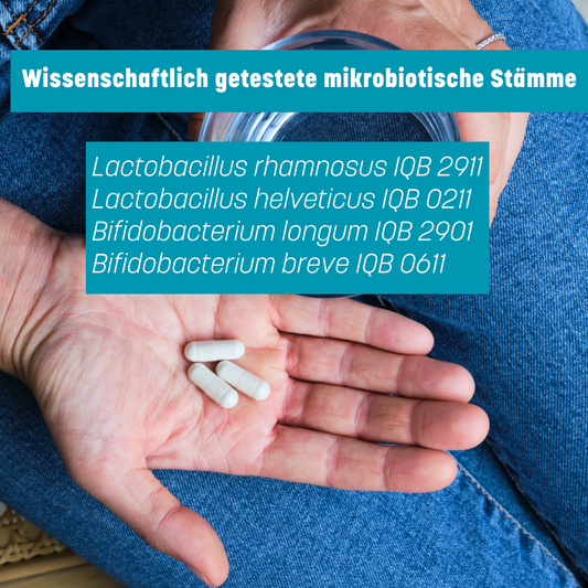 ✓ Probiotische Stämme für die Darm-Hirn-Achse: Bifidobacterium longum IQB 2901, Lactobacillus rhamnosus IQB 2911 und Lactobacillus helveticus IQB 0211 sowie Lactobacillus plantarum IQB 8386, die das Gleichgewicht im Darm unterstützen.