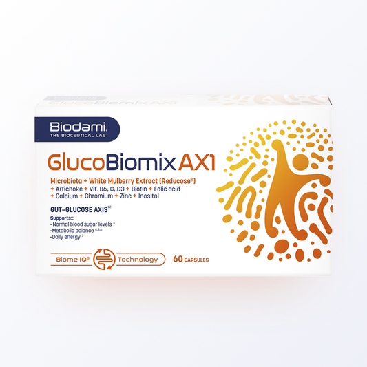 GlucoBiomix AX1 se formuló en torno a esta idea. Las cepas probióticas fueron seleccionadas por su papel documentado en la producción de AGCC y el apoyo a la vía GLP-1. La reducosa se encarga de la absorción. El cromo contribuye a la señalización de la insulina.