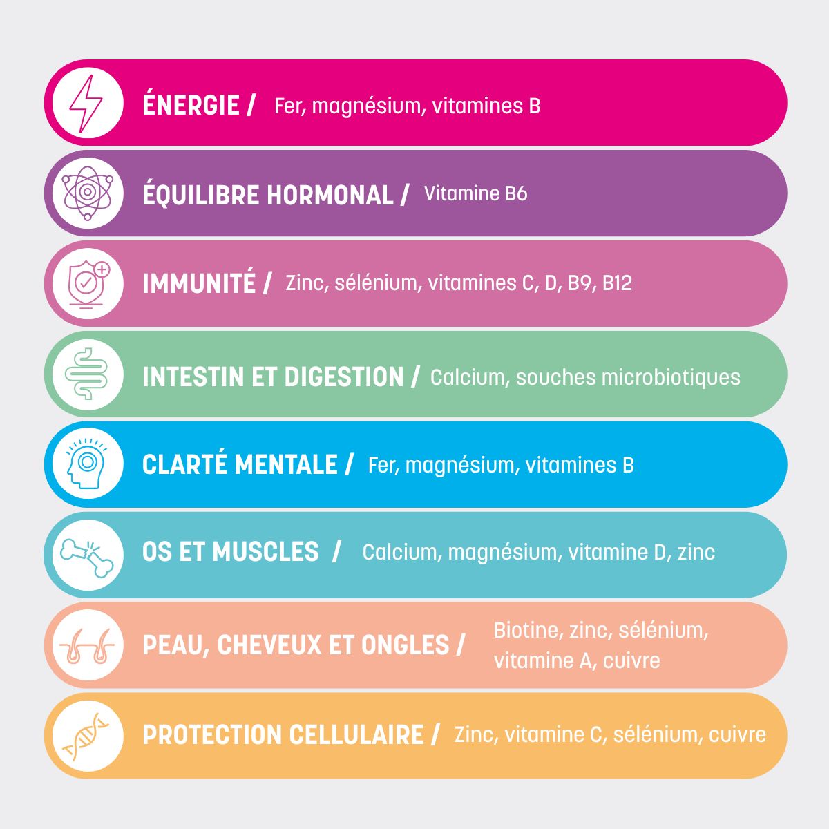 🛡️ Système immunitaire → Le zinc, le sélénium, le fer, les vitamines C, D, B6, B9 et B12 contribuent tous au fonctionnement normal du système immunitaire. Ils aident votre corps à rester résilient au fil des saisons, du stress et de la vie quotidienne.