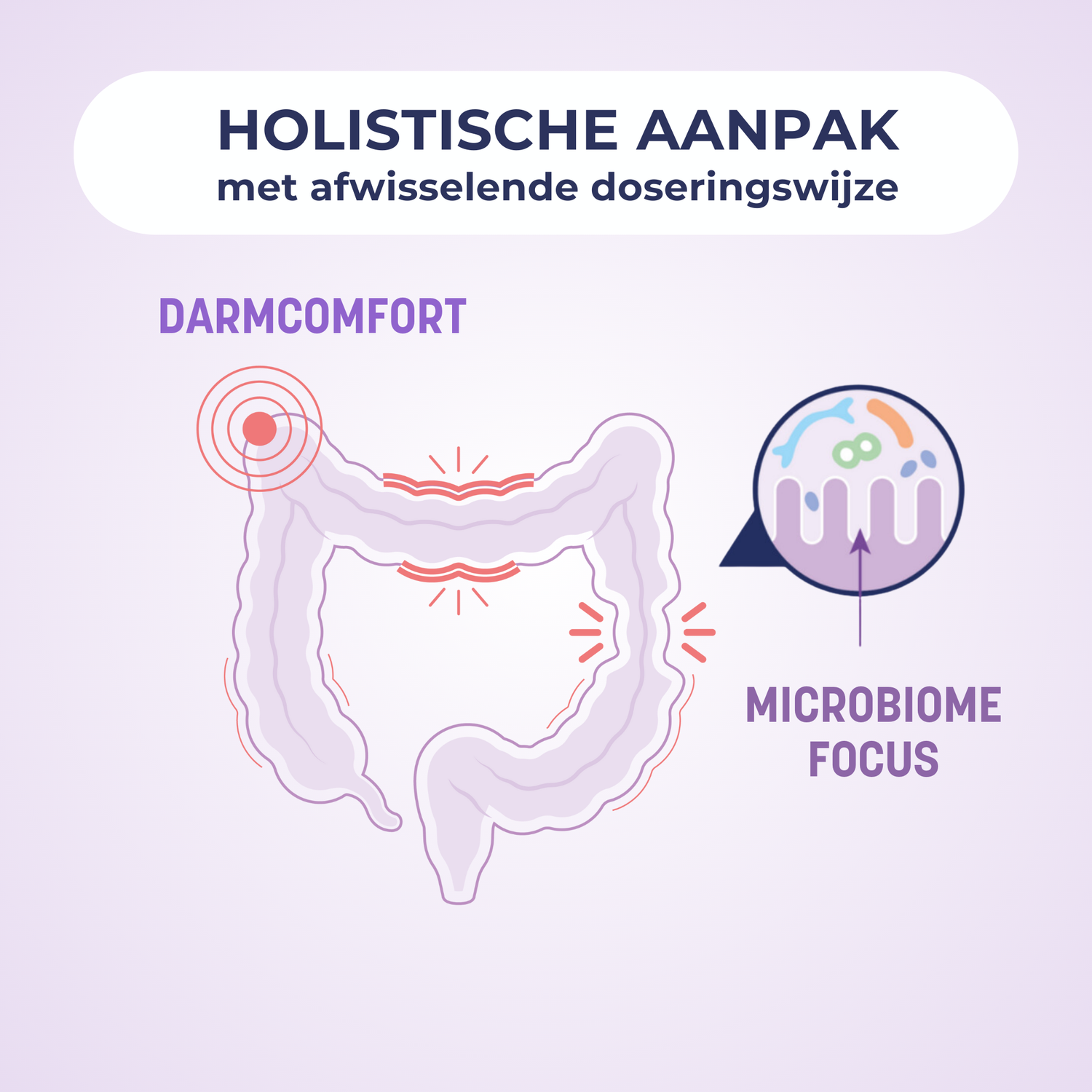 Een geïntegreerde oplossing, ontwikkeld ter ondersteuning van het darmcomfort en het algemene welzijn.